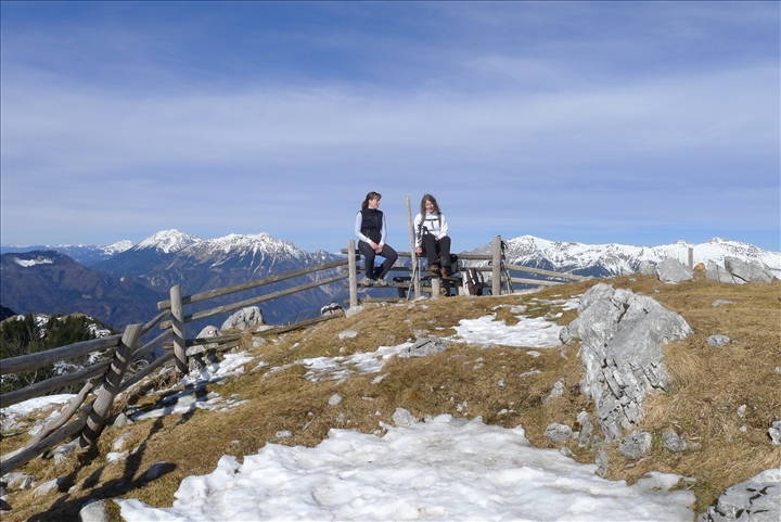 Po točno 2 urah smo osvojili 1715 m visok Tolsti vrh. S svojo razprostranjenostjo in zaokroženostjo z leseno ograjo kaže prav idilično podobo. Vrh predstavlja majhen nadstrešek, kjer smo se vpisali v knjigo. Nekaj časa smo porabili še za malico in za razgledovanje po okoliških hribih in gorovjih. Na vzhodno stran se je pogled razprostiral na bližnji Storžič in Krvavec, na severni strani smo opazovali pogorje Košute, proti severozahodu smo gledali Begunjščico in Stol, najbolj pa nas je očaral pogled v zahodni smeri proti Julijcem s Triglavom na čelu. Ker je bila za Dejana to prvi višji vzpon v hribe, sva mu z Janjo pripravile malo neobičajen krst. Dejan je s prevalom v snegu in z odgovorom na vprašanje o višini osvojenega vrha dokazal, da ga lahko sprejmemo med hribovce. Naredili smo še par fotografij za spomin, nato pa se podali proti koči na Kriški gori. Na začetku smo se zaradi snega spuščali bolj previdno (dereze niso bile potrebne), smo se pa na račun malo bolj nerodnih korakov več nasmejali.